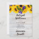 A bold black handwritten script calligraphy and country rustic white wood with yellow and purple sunflower floral backyard wedding invitations.
