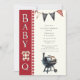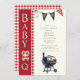 Host a memorable couples baby shower with this delightful 'Baby Q' themed invitation. Featuring a vibrant red and white gingham pattern, this design captures the essence of a backyard barbecue celebration. The centerpiece illustration includes a vintage-style barbecue grill, ready to fire up, alongside a sweet baby romper in the same classic gingham print. It's a charming and unique way to announce your celebration and invite loved ones to share in the joy. Perfect for a relaxed and fun gathering, this invitation ensures your guests feel welcomed and excited for the event.
