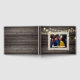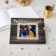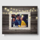 A beautiful brown faux woodgrain background has a large white ornate edged picture photo frame on it and string lights across the top edge which appear to shimmer and shine. A single calligraphy script template for the couples name appears on the bottom edge of the photo. Photographs with a dark background will work best with this simple but striking design.
