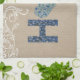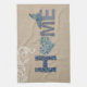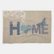 Patchwork letters with blue and white floral heart spell out Home in this pretty country style design on a rustic burlap effect linen background. Added details of a blue butterfly and white floral scroll pattern. Designed by Lark Designs