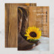 Invite guests to an informal yet elegant barn party honouring the bride to be with the charming Country Sunflower Western Bridal Shower Invitation. This casual and classy custom ranch theme Wedding Shower Invite features a quaint floral photograph of brown leather cowboy boots, yellow sunflower blossom and barn wood on white satin. Available as a printed invitation for mailing or as a digital download for easy sharing digitally online.