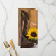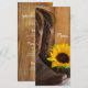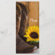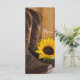 Customize the pretty Country Sunflower Western Wedding Menu with the details of the meal that you will serve at your informal rural farm or ranch style engagement barn party, bridal shower or marriage reception by adding the salad or first course, entree or second course and dessert or third course. This charming custom rustic wedding menu features a quaint floral photograph of a yellow sunflower blossom, brown leather cowboy boots and barn wood. Perfect inspo for a casual barn party celebration event.