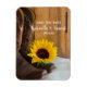 Set the tone for your upcoming casual yet classy rural farm or ranch style marriage ceremony and reception with the charming Country Sunflower Western Wedding Save the Date Flexible Magnet. This informal and elegant custom rustic chic wedding keep the date bendable magnet features a quaint floral photograph of brown leather cowboy boots, yellow sunflower blossom and brown barn wood on white satin. Perfect inspo for a relaxed barn party celebration event.