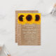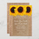 This rustic wedding invitation is perfect for any country western wedding. It features a rustic country printed burlap background on both sides of the invitation. The top has three beautiful sunflowers. The burlap is just a printed design. It is not actual burlap fabric. The back also has the burlap design and one sunflower in the middle of the announcement.