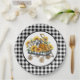 A Beautiful Black And White Gingham Pattern Paper Plate Designed With Vintage Toy Wagon With Sunflowers and Pumpkins.