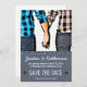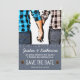 Perfect for the country, southern, or farming man and woman, this cute black and white with red and blue plaid save the date future wedding announcement invitation features a cute posterised photo image of an affectionate and loving country couple holding hands. They are both in casual attire, wearing farm clothes perhaps, in blue jeans and plaid work shirts. Bold, dramatic white text on blue jean denim pattern background with stitch accents and rivets. Customise the invite with your own personalised wedding date and name details. Original photo image was public domain from kozzi.com Denim accents from DigitalScrapbooking.net