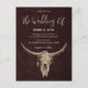 Invite your guests to your special day with these country western ranch style, brown farmhouse rodeo bull skull vertical wedding invitation postcard. Modern vintage rustic texture background to customise your information on. Image copyright Marg Seregelyi Photography.