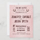 A cool typography style rustic country wedding invitation on an elegant swirl flourish pink background. There are two small horseshoes at the top of the invitation framing the "You are invited to the wedding celebration of" text.