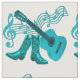 This fabric has a light blue guitar and light blue cowboy boots. There are music symbols in the background. This is shown on white fabric, but it can be changed to any colour using the customise button and the background colour selector.