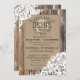 Rustic country western wedding invitation card design with white lace over linen-look background and aged wood planks.