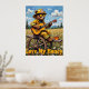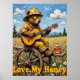 This heartwarming artwork captures a bear dressed in firefighter gear, including a helmet and sunglasses, playing an acoustic guitar while comfortably seated on an old wooden wagon wheel in a sunlit field filled with daisies and other wildflowers. A jar of honey with a dipper rests close by. The background features a blue sky with fluffy clouds and distant trees. The painting's thick, textured strokes add to the endearing quality of the image, with the words "Love My Honey" featured below.