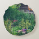 Round Pillow featuring a photo of peaceful summer garden and cosy wooden cottage for gardening enthusiasts, country, rustic and eco-style lovers.