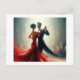 A couple is captured mid-dance, with the woman wearing an elegant red dress and the man in a classic black tuxedo. They are engaged in a formal ballroom dance, set against a blurred background that suggests a grand, possibly opulent environment.