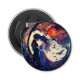 A bottle opener featuring a stained glass design of a couple and moon.