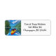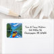 Kayaking themed return address labels. AI Art depicting a serene scene with a man and woman kayaking in the mountains.