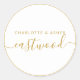A modern elegant envelope seal featuring, handwritten gold script last name contrasted with simple sans serif first names font. A modern minimalist style wedding stationery notecard for newlyweds or longtime spouses. Blending vintage and modern styles. Black on white neutral style. Order in larger quantities for greater savings. Gold circle border