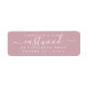 A white script monogram in vintage sans serif type, contrasted with a handwritten style script font return address label. A modern minimalist style style notecard for newlyweds or longtime spouses. Order in larger quantities for greater savings. White on dusty pink.
