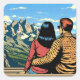 Cute stickers for someone who likes hiking and the mountains. Couple having a romantic moment sitting on a bench look at a scenic view.