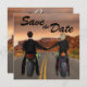 This unique Save the Date invitation features beautiful rocky highway scenery with a boy and girl couple on motorcycles holding hands. The boy has brown hair and the girl has blonde hair. Other hair colour combinations are available upon request! Perfect for a biker couple! Easily customise this Save the Date with all of the details for your wedding.