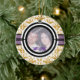 Couple’s first Christmas yellow damask pattern custom photo ornament. There is a black and white circle for your photo and a black and purple stripe.