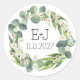 Simple and elegant botanical theme wedding sticker featuring the couple’s initials surrounded by lush eucalyptus and daisies.