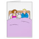 A cartoon couple in bed with their white cat sitting between them.