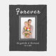 This personalised keepsake will preserve your memories and keep you warm at the same time. This design can be customised with your favourite picture, names, and date. The title text currently displays the word "Forever" in a hand written script font, but this text can be altered in the Edit Menu if you wish. The white typography is set in both a popular San Serif font (the date) and an elegant script font and placed on a subtle black and grey stripe pattern. The pattern will be more visible when it is enlarged to the size of the blanket.
