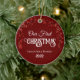 Our first Christmas with couples name and date script ornament keepsake with white on a dark red background and red holly berries. Just add names and date on the front. Happy new year printed on the reverse. Just pick your style.
