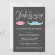 A cute, whimsical gender reveal couples baby shower invitation with a moustache and lips against a chic dark background. Also available with a white background:
