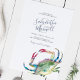 Set on a crisp white background, this design features your names in modern handwritten script and event details in a timeless charcoal gray font. A bold blue crab, hand-painted in vibrant reds, blues, and greens, brings nautical flair to the front, while a sophisticated navy reverse side completes the look.