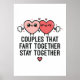 Add some humour to your love story with this "Couples That Fart Together Stay Together" design! Featuring two cute cartoon hearts with a funny and relatable message, this design is perfect for couples who aren't afraid to laugh at life’s quirks. Whether you're celebrating Valentine's Day, an anniversary, or just want a fun surprise for your boyfriend, girlfriend, husband, or wife, this design is sure to bring joy. A great gift for couples who value love, laughter, and a little playful humour in their relationship.