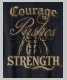 The design features the bold text "Courage Pushes Strength" in a regal, serif font. The words are rendered in a rich palette of deep, royal colours, creating a majestic and powerful aesthetic. The design is centred on a solid, light blue background, providing a clean and modern canvas for the message.