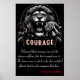 Unleashed Courage is depicted in this high-contrast black and white image. A fierce lion roars, a display of raw power, while a small tiger cub playfully climbs on its back. The dark background emphasizes the subjects. "Courage" is written in bold, elegant red font in a stylised text box below. Nelson Mandela's quote reinforces the theme: "I learned that courage was not the absence of fear, but the triumph over it. The brave man is not he who does not feel afraid, but he who conquers that fear."