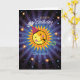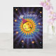 A smiling yellow and red sun with a party hat and blower radiates happiness out to all the celestial and shooting stars. Sentiment is: "Today is your day to be the centre of the Universe."