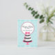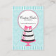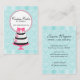© 2014 Socialite Designs. A couture cake bakery business card with an elegant swirls and floral cake design, topped with a pink ribbon. The background has a beautiful turquoise damask and stripes pattern.