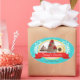 © 2014 Socialite Designs. Our elegant bakery box seals / stickers have a cupcake, three-tier rose case, and sugar cookie inside an oval. The oval design has an elegant flourish on its sides. The background has a beautiful turquoise damask pattern. Add you business name to the ribbon banner.