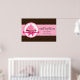 © 2014 Socialite Designs. Elegant poster design incorporating a cupcake with pink icing inside a round lace design. Your text goes into a pink and white banner with a scalloped lace-look edge. A pink ribbon adds a touch of elegance to the design. The background has a a brown damask pattern.