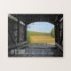 Enjoy hours of fun with this puzzle featuring a scenic photograph of a sunny field looking through an old covered bridge in Indiana. The inspirational quote says "Life is Short and the World is Wide."