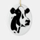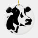 Christmas ornament shown in a round shape with a cute black and white cow print. Customise this item or buy as is.