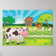 Farm scene of a cow grazing and a rooster on a fence. This design looks really effective on these Poster