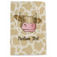 Cow's head illustration. Seamless cow pattern background. Custom text on both sides.