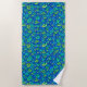 Beach towel featuring colourful floral pattern - yellow pond lily flowers, broad green leaves and blue dragonflies. Hand drawn texture