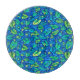 Cutting board features brightly coloured floral pattern - yellow pond lily flowers, broad green leaves and blue dragonflies. Hand drawn texture