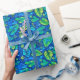 Wrapping paper featuring colourful floral pattern - yellow pond lily flowers, broad green leaves and blue dragonflies. Hand drawn texture