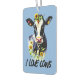 A dose of "Fresh Country Air" that actually smells good for your commute! This cute cow car air freshener features a funny Holstein wearing a bright yellow sunflower on its head and the words "I Love Cows". This farm animal design adds a charming touch to your rearview mirror while keeping your vehicle smelling delightful. The perfect small auto accessory for cow lovers wanting to customize their car, truck, or SUV with a cheerful country vibe.