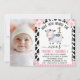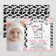 Cute cow themed or have you heard the moos first birthday invitation for a baby girl featuring a cute black and white cow and faux gold number and a photo. This girl's first birthday invitation also features a bold cow print pattern, pink plaid pattern and some lovely pink floral roses.