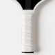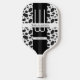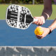 A monogram pickleball paddle in black, white, and grey with a cow print background.