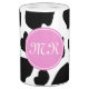 Black and white Cow print Toothbrush Holder and Soap Dispenser Set Funny animal pattern design with personalised initial letters. Customisable background colour. Cute bathroom gift idea for cow lover.