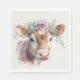 Watercolor portrait of a cow with pink flowers and ivy headpiece.
