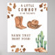 Saddle up! This watercolor cowboy design. This design features modern neutral colours in a watercolor application. Design in cow print, cowboy hat, desert cactus, cowboy boots. "A little cowboy is on the way"
